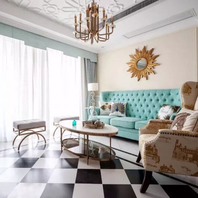 这是一款混搭美式风格,颜色鲜亮,许多地方都做了灵活的设计,和讲究和谐稳健 含蓄的美式风格略有不同。在家具的选择上,明显更简单明快。