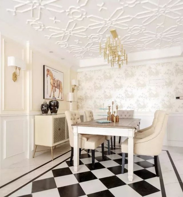 这些高高低低的烛台产生跳跃感,花束让烛台和桌子结合的更家自然,他们一起呼应了墙壁上的金光闪闪的壁画。