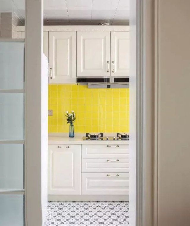 厨房采用了米白色的橱柜,非常简练,灶台四周的草组曲被贴上了明亮的黄色, 显得活力而健康