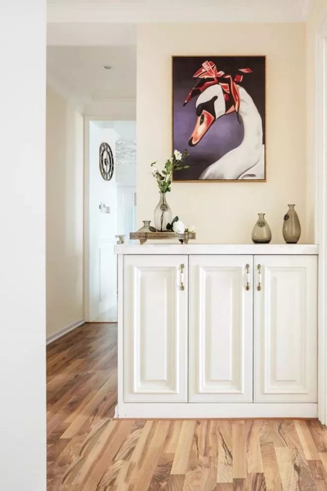 空间的转角处形成一个缺口,为了补救,一个收纳柜被放在这里,摆件的配合让它成为一个带有韵味的角落。