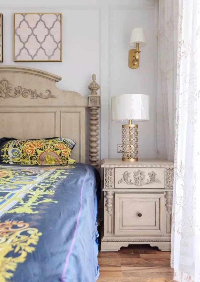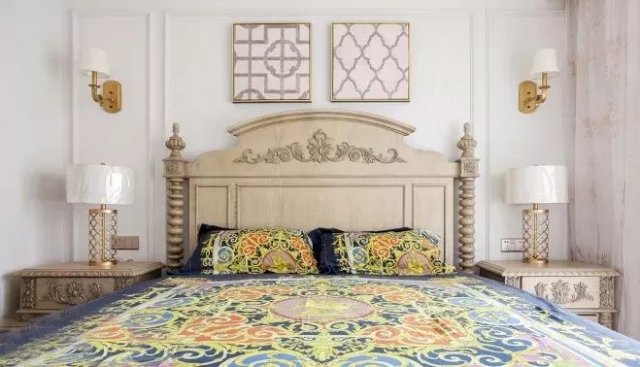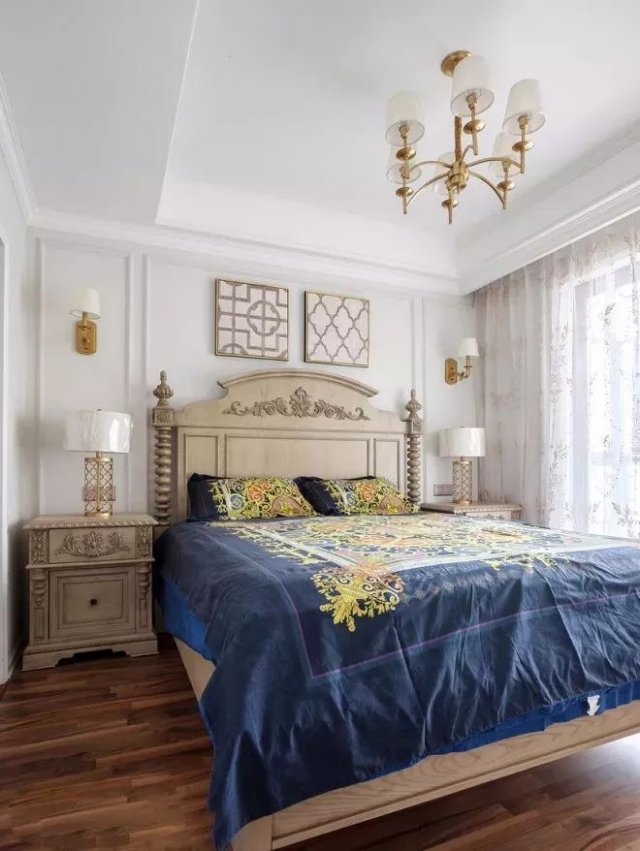 主卧的色彩和床品中西合璧,床和床头柜是美式的,更接近于欧式的,而床罩是中国古典风格,蓝色和金色搭配出很独特的华丽感。