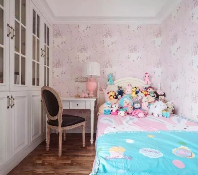 儿童房以粉色作为基调,白色的小床和小桌,充满童趣。