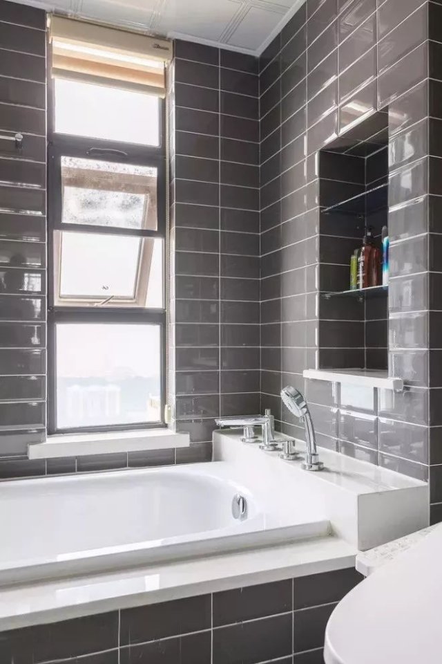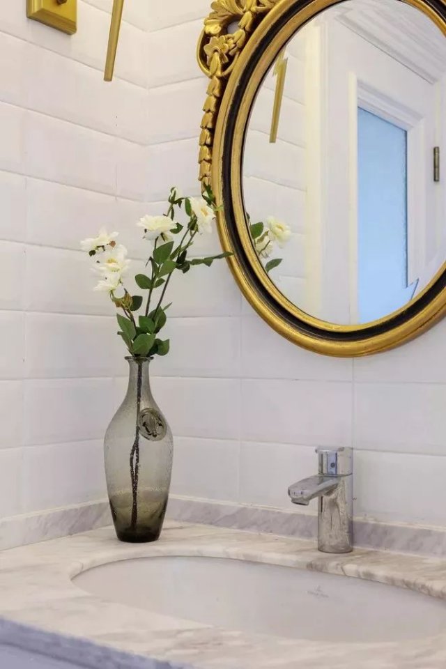 浴室设计了一个盆浴池塘,黑灰色的瓷砖含蓄,且越陈旧越有韵味。做旧的镜子和插花瓶让这个角落充满了似曾相识的感觉。