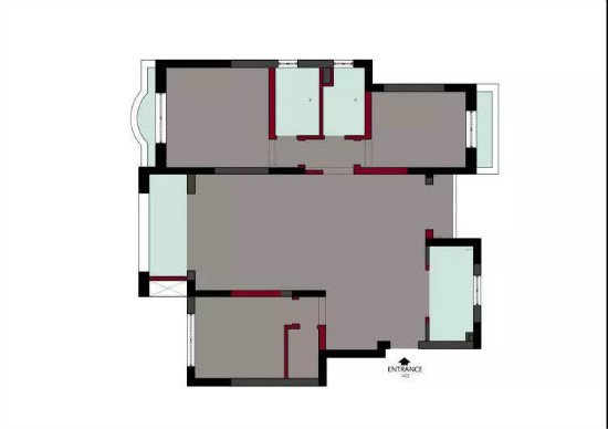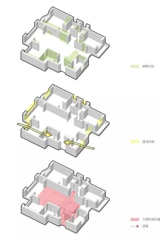 从原始户型图可以很明显的看出,入户区域空间面积完全开敞,门厅与起居空间没有功能界限;两个卫生间没有设置分项(主人使用或客人/公共使用);入户左边的房间门正对厨房,空气对流不合理,储纳空间少等问题。