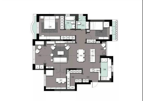 在客厅区域布局LDK(Living/Dinning/Kitchen)集成;改变传统沙发要有背景墙,而采用围合式交流式布局方式,同样是客厅,它的意义再也不是朋友来做客一起看电视的尴尬状态,面对面的交流,更是年轻人的状态!