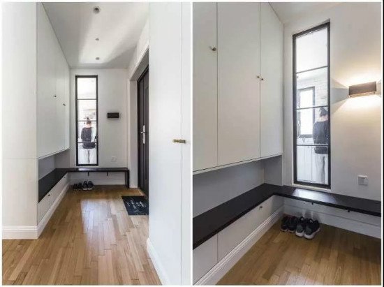 玄关是室内和室外的过渡空间 ,家人可以在这里调整心情,在这条“脱鞋”的分界线上,自然地就能区分出家的感觉和街道的感觉!特地留出一个窄窄的小窗,除了从厨房引入自然光线,让白天这块区域也亮堂堂之外,当男主回到家透过小窗也能看到正在为自己烹制美食的女主。