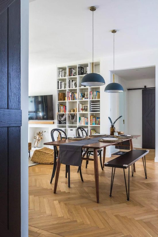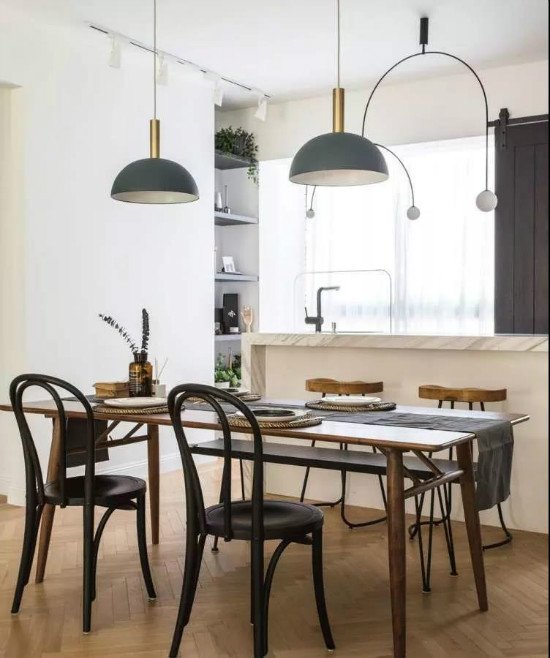 从沙发处往右看是餐厅空间,依旧是浅白色背景+暗色餐桌的对比,空间配色层次明朗也不单调~