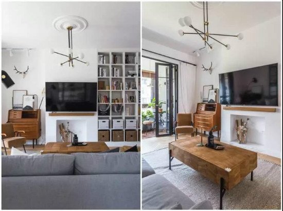 往左就是客厅了,白、木打底的配色,在空间中穿插分子灯、纤细底腿家具、高低错落绿植,不同材质和纹理的在空间中穿插,增加了空间的层次感,也营造出古朴自然的北欧度假风,让身处钢筋混凝土丛林中的屋主夫妇,归家后能感受到乡村自然中的放松!