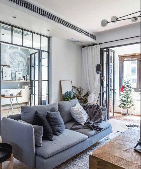 在沙发的一侧,黑框的玻璃叠门完全打开的时候,便和客厅处在同一空间中,让阳光和空气自在流通,太阳太过于毒辣的时候,百叶窗就像知音一般,不仅能调节室内光线保证空气流通,还将阳光和烦躁挡在窗外!从阳台一侧墙面上的窗形镜里,可以看到郁郁葱葱的绿植,视觉上放大空间的同时,也绿意摇曳起来!