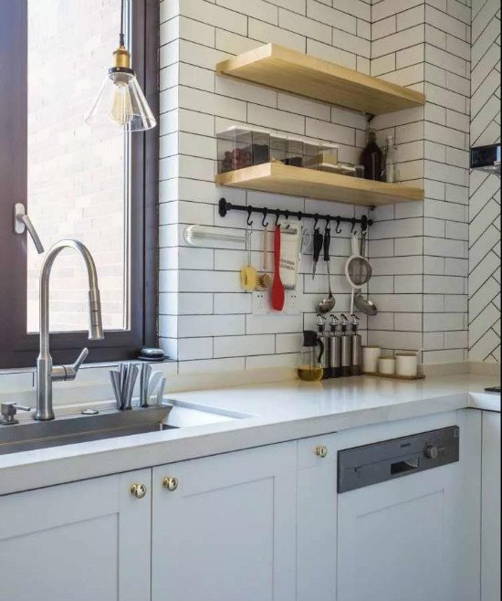 厨房中的收纳同样也是小区域的展示收纳(方便)+大体量的隐藏收纳(卫生),让空间呈现出整洁和清爽的模样!
