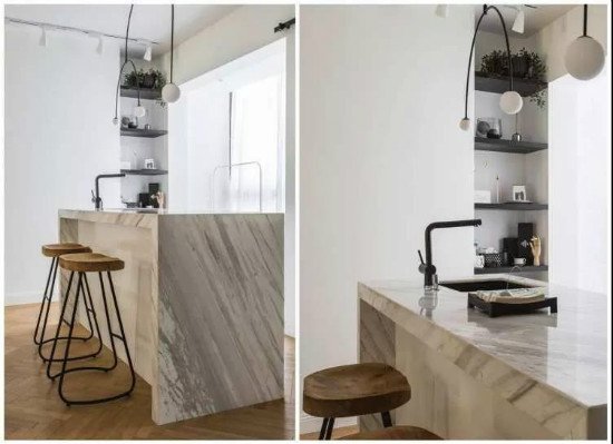 大理石的台面下做了镂空刚刚好放下2个高脚凳中岛的四周分别是玄关鞋柜背面的茶水柜,装着谷仓门的厨房入口,做了壁龛的装饰墙面,和餐厅、客厅、阳台