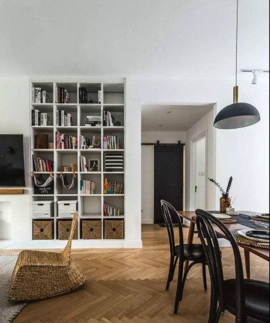 空间内如此顶天立地,开放式收纳,也有自己的实用技巧,下面的位置方便弯腰拿取,客厅零散的物件,和小孩的玩具可用置物筐统一收纳!
