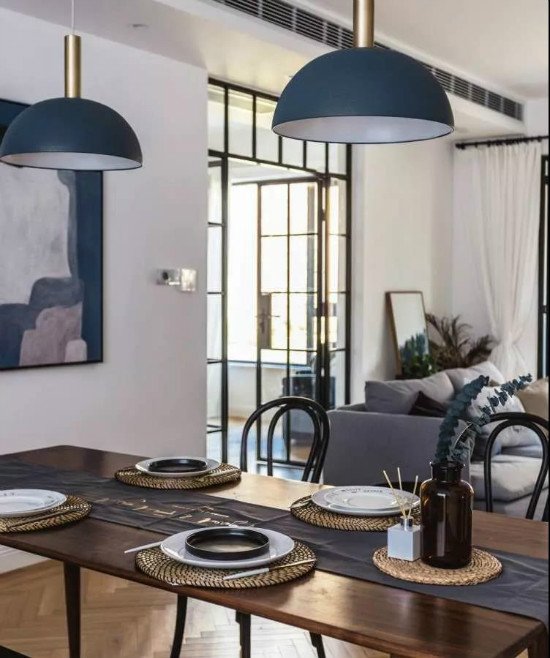 木制的家具搭配藤编的餐垫,悬垂的青灰色吊灯,与大面积的暖色互为补充,放松感自然而然的就有了!