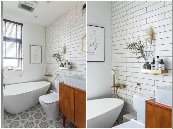 主卧卫浴中,放了大浴缸+暖木偏红的台盆柜,让空间特别温暖,墙上的挂画和黄铜的置物架,丰富了空间的质感,提升了精致度!