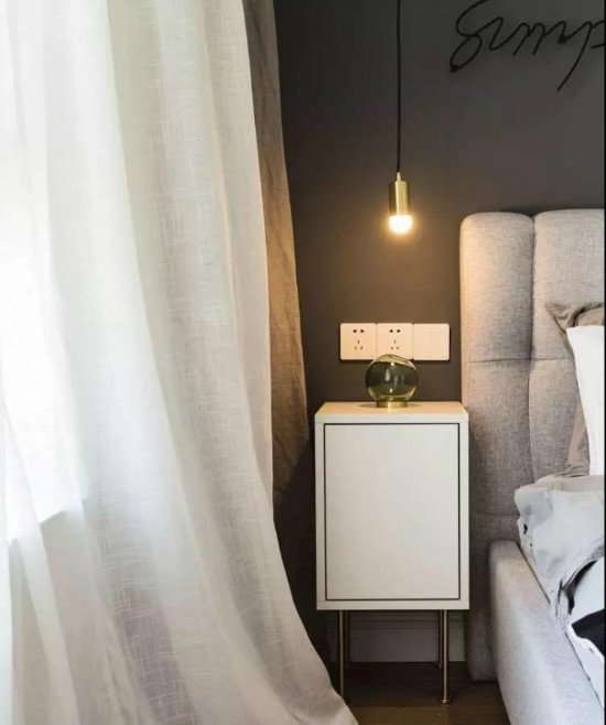 一张局部小景也动人!若是孤立着看,悬垂着的小灯并无装饰性,但是在这样一面刷上灰色乳胶漆,搭配灰白色软包床,小小的黄铜灯头演绎下,美好有时候就是这么简单!
