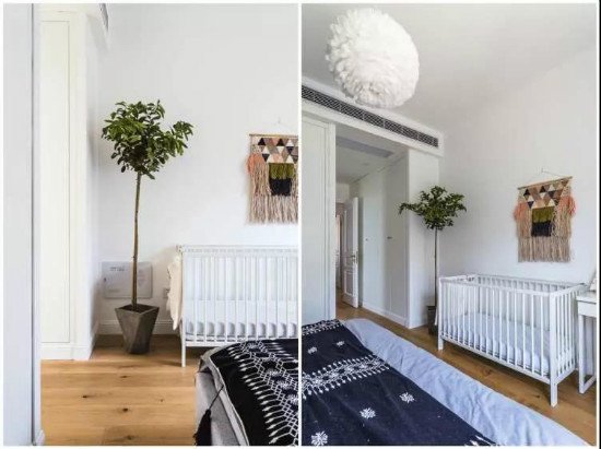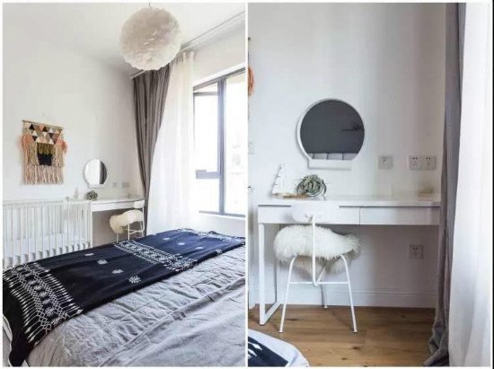 女儿刚1岁还在哺乳期,便伴着这张白色的婴儿床,取代了主卧电视的存在,在大人休息的时候也更方便照顾宝宝!角落的梳妆台,简单又有仪式感!