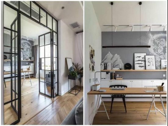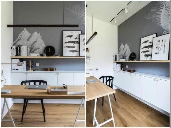 关于书房的设计,其实早在19世纪中叶,物理学家库尔特·考夫卡就曾提出,人的行为会被行为所发生的场域所影响,于是为了Hedda和家属心无旁骛的工作,工作室就设计成了这般极简的模样~深灰色的背景墙壁上展示搁板收纳+隐藏柜体收纳,方便实用,空间宁静又清新!