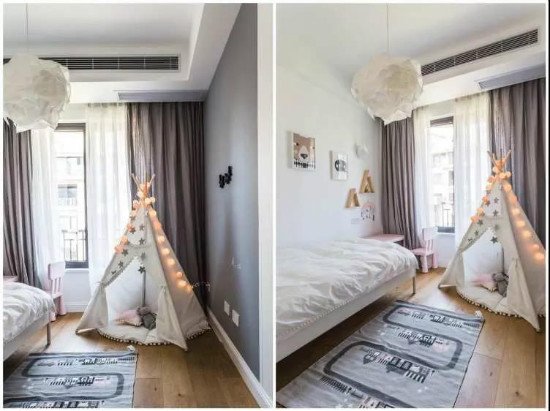 初为父母的俩夫妇,总算借着这次装修的机会,把幻想了很久的Ins风儿童房一次实现了!虽现在的女儿还不能自己住,但只是看着她在小帐篷里玩玩具,心都要萌化了~~