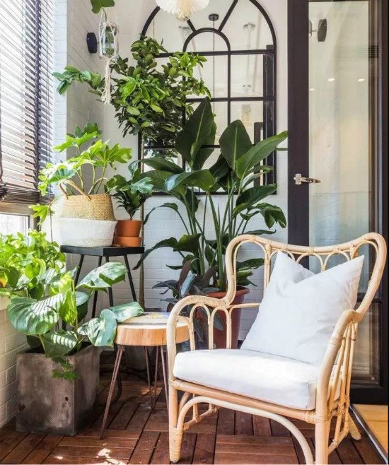 在设计这套房子时,面对横向的阳台和窗户,想起了多年前在加拿大求学的日子,下课回家路过的咖啡馆,铁艺门窗前摆满了层层叠叠的绿植,店铺外的藤椅,喝咖啡的客人悠闲又自在!于是就有了这一组阳台小景灵感!