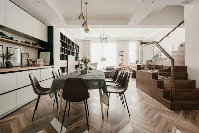 设计师调整了原楼梯上楼的位置,从户型图上看,原本的位置浪费了一大块区域,动线不分明,而通过设计师的改变后,将空出来的区域“变”成了现在的餐厅。